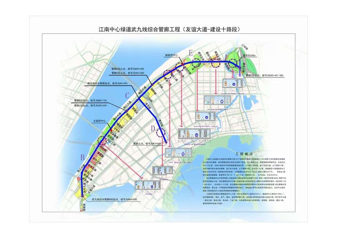作為省市兩級重點工程,武九綜合管廊全長約16.2公里,是武漢市城市地下綜合管廊專項規(guī)劃確定的重要干線管廊,創(chuàng)下多個“國內之最”。它是國內城市核心即老城區(qū)單次建設規(guī)模最大(長度、斷面)的綜合管廊,是服務城市核心功能區(qū)(武昌濱江商務區(qū)、青山濱江商務區(qū)、華中金融城)數(shù)量最多的綜合管廊。